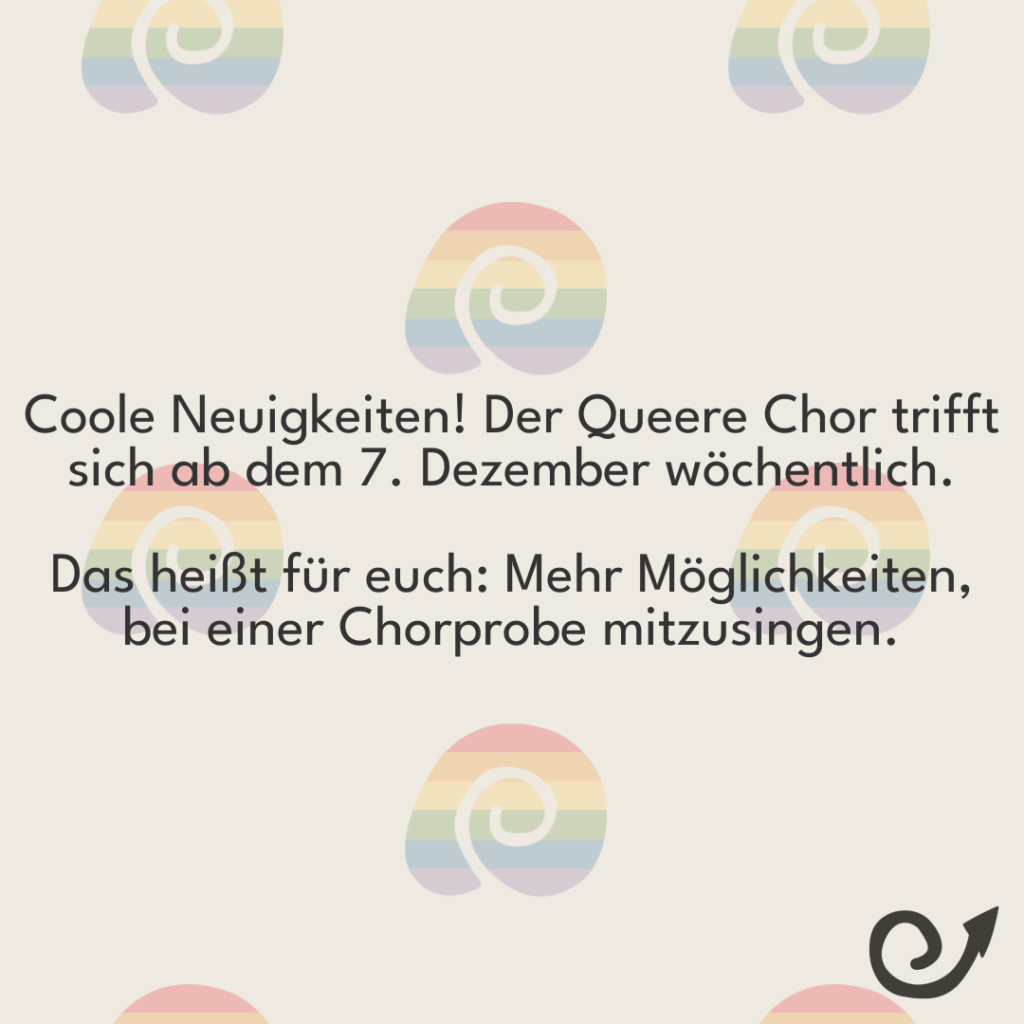 Coole Neuigkeiten! Der Queere Chor trifft sich ab dem 7. Dezember wöchentlich. Das heißt für euch: Mehr Möglichkeiten, bei einer Chorprobe mitzusingen.