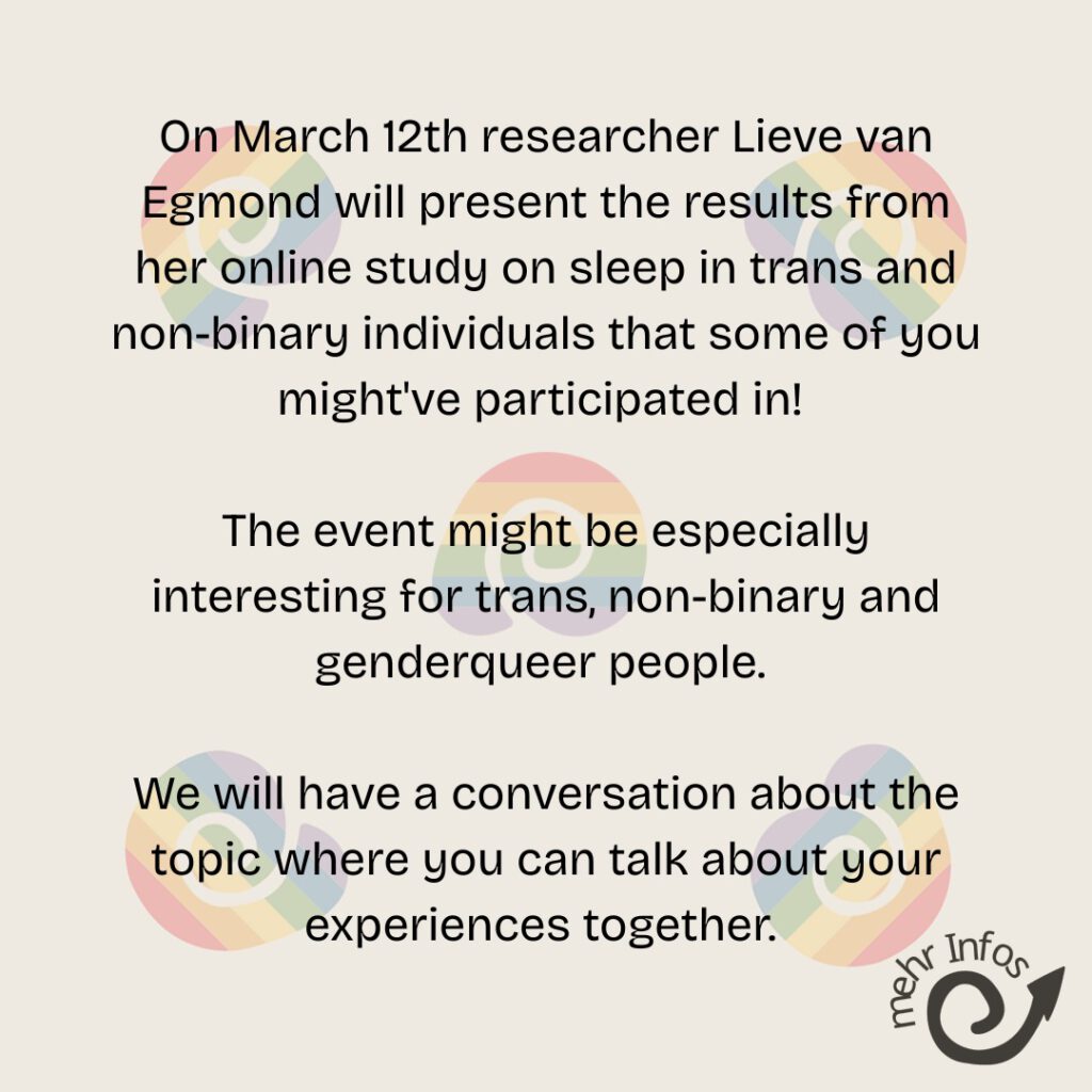 Am 12. März wird Wissenschaftlerin Lieve van Egmond die Ergebnisse ihrer Online-Studie zum Schlafverhalten von trans- und nicht-binären Personen vorstellen, an der einige von euch vielleicht teilgenommen haben!