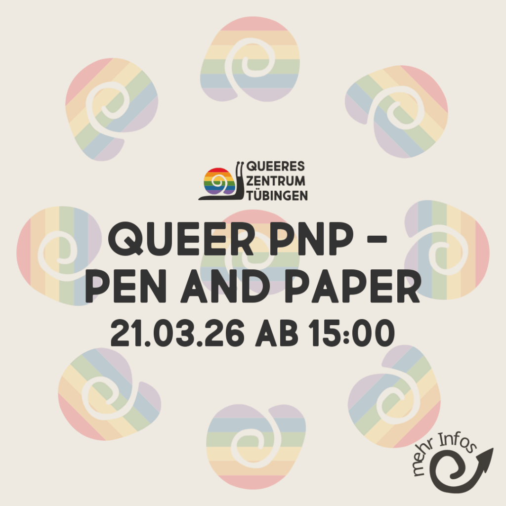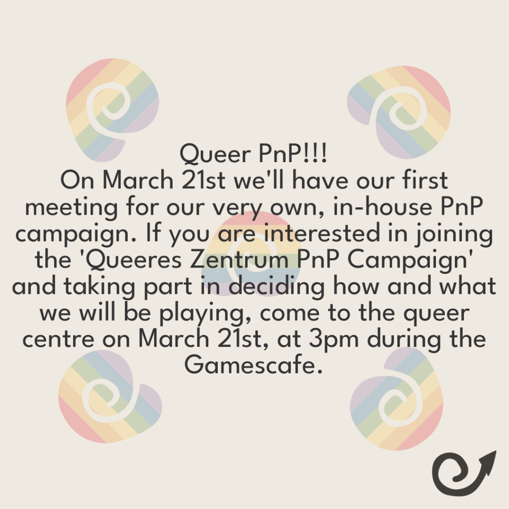 Queer PnP!!! On March 21st we’ll have our first meeting for our very own, in-house PnP campaign. If you are interested in joining the ‚Queeres Zentrum PnP Campaign‘ and taking part in deciding how and what we will be playing, come to the queer centre on March 21st, at 3pm during the Gamescafe.