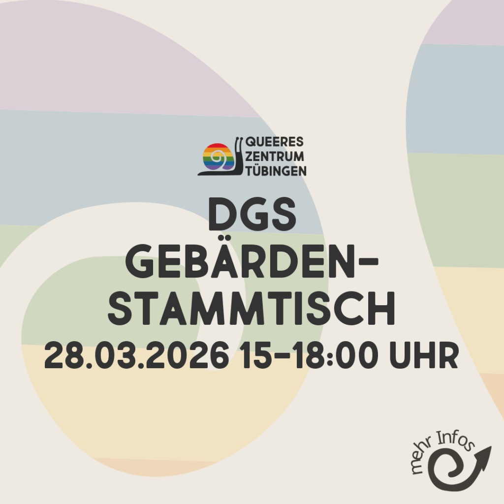 Du gebärdest oder übst es? Super! Dann komm zu unserem Gebärden-Stammtisch. Wann? Samstag 24.01. 15:30 Uhr Wo? Queeres Zentrum: Derendinger Str. 41, Tübingen-Derendingen Wer? Alle, die gebärden, unabhängig von Hörstatus oder queerness. Was? Mit dem Gebärden-Stammtisch möchten wir einen Treffpunkt bieten, um Kontakte mit anderen gebärdenden Personen zu knüpfen und DGS anzuwenden. Hauptsprache ist DGS. Für alle, die noch nicht so sicher damit sind, schummeln wir natürlich mit dem Fingeralphabet oder mit Aufschreiben. Unser Treffen findet gleichzeitig zum Café-Betrieb des Queeren Zentrums statt – wer mag kann sich also ein Getränk auf Spendenbasis holen. Ob wir während dem Treffen uns nur unterhalten oder Spiele spielen kommt darauf an, worauf die Anwesenden Lust haben. Julian und Rene werden Angebote machen. Wer steckt dahinter? Julian und Rene sind beide hörend und lernen DGS. Du möchtest auf dem Laufenden gehalten werden? Komm in die Signal Gruppe DGS Vernetzung. Die ist für alle, die in und um Tübingen interessiert an Gebärdensprache sind. Dort schicken wir auch nächste Termine etc. rein: Barrieren und Fragen: Im Queeren Zentrum haben wir die Möglichkeit, gute Lichtverhältnisse zu schaffen. Mit dem Rolli: Die Räume befinden sich im ersten Stock und sind über einen Aufzug stufenlos zu erreichen. Falls du am Bahnhof abgeholt werden möchtest, um gemeinsam zum Queeren Zentrum zu laufen, oder andere Fragen hast melde dich unter: dgs-stammtisch@hyteck.de