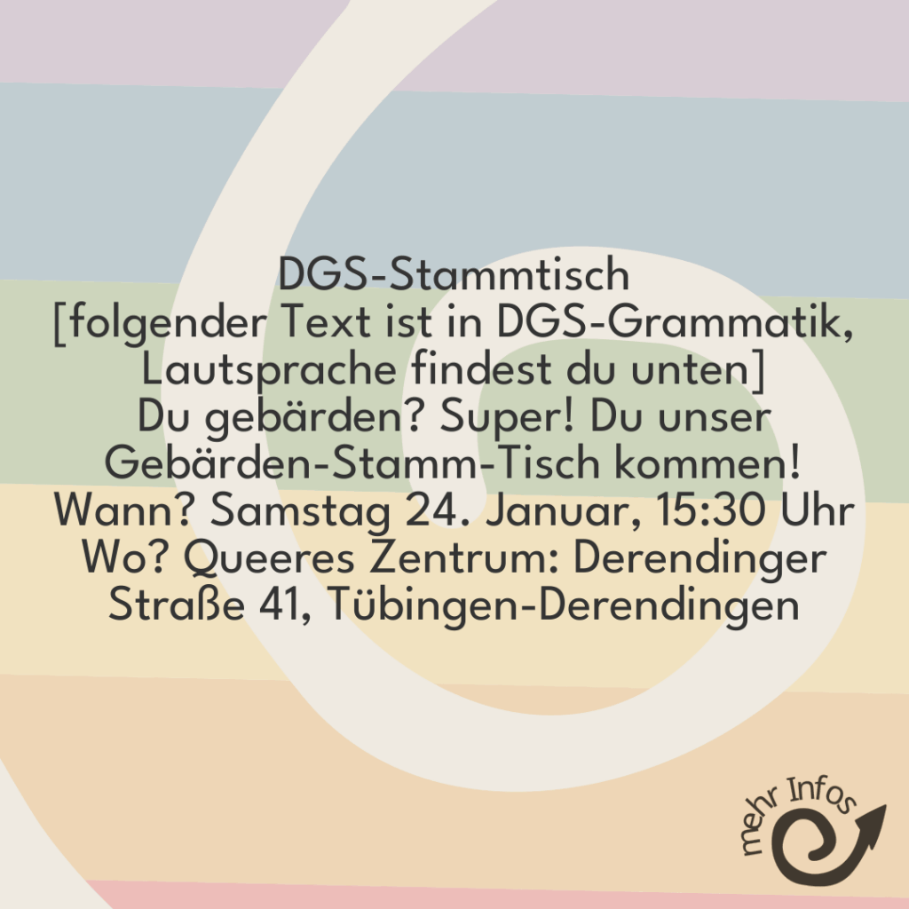 3:00 pm – 6:00 pm Gebärdensprache-Stammtisch (DGS) DGS-Stammtisch [folgender Text ist in DGS-Grammatik, Lautsprache findest du unten] Du gebärden? Super! Du unser Gebärden-Stamm-Tisch kommen! Wann? Samstag 24. Januar, 15:30 Uhr Wo? Queeres Zentrum: Derendinger Straße 41, Tübingen-Derendingen Wer? Alle Personen gebärden kann. hörend, taub/gehörlos, schwerhörig egal. Heterosexuell oder queer: egal. Was? Wir Wunsch treffen, Grund: 1) Personen gebärden kann, die kennenlernen 2) gebärden; DGS üben Personen gebärden-unsicher wir Fingeralphabet oder schreiben kann. Aber Wunsch: Personen hörend: Stimme aus. Queeres Zentrum Café offen. Du Getränk holen kann, aber du muss-nicht. Kostet: selbst entscheiden, Spendenbasis DGS-Stammtisch da Gespräch kann, da Spiele spielen kann – Frage-alle: Lust was? Julian, Rene Angebote machen. Die-beide Wer? Julian, Rene beide hörend. DGS lernen. Du Wunsch Bescheid? Beispiel nächster Termin? Signal-Gruppe kommen kann, Name DGS Vernetzung. Signal-Gruppe Bereich Tübingen, für Personen, die DGS üben oder Wunsch DGS lernen oder gebärden. Barrieren, Fragen: Queeres Zentrum, da Licht einstellen kann. Wir Queeres Zentrum Bescheid: Licht hell muss. Rollstuhl: Café wo? 1. Stock. Aufzug da. Stufen nicht-vorhanden. Du Wunsch Bahnhof wir-abholen-dich? E-Mail: dgs-stammtisch@hyteck.de Du Fragen? E-Mail: dgs-stammtisch@hyteck.de