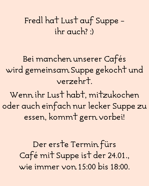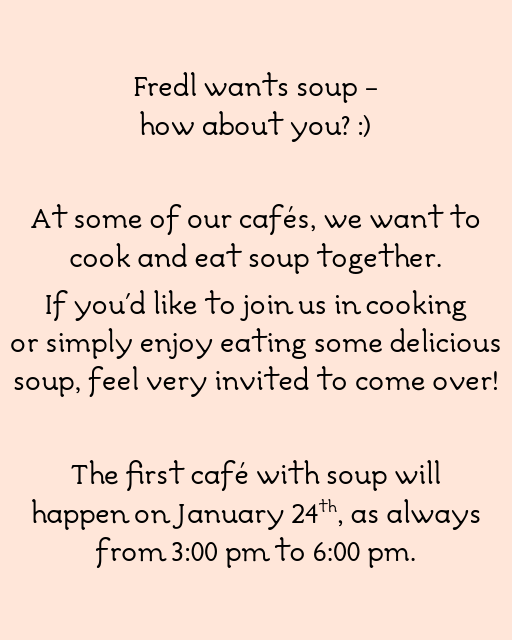 Der erste Termin fürs Café mit Suppe ist der 24.01., wie immer von 15:00 bis 18:00.